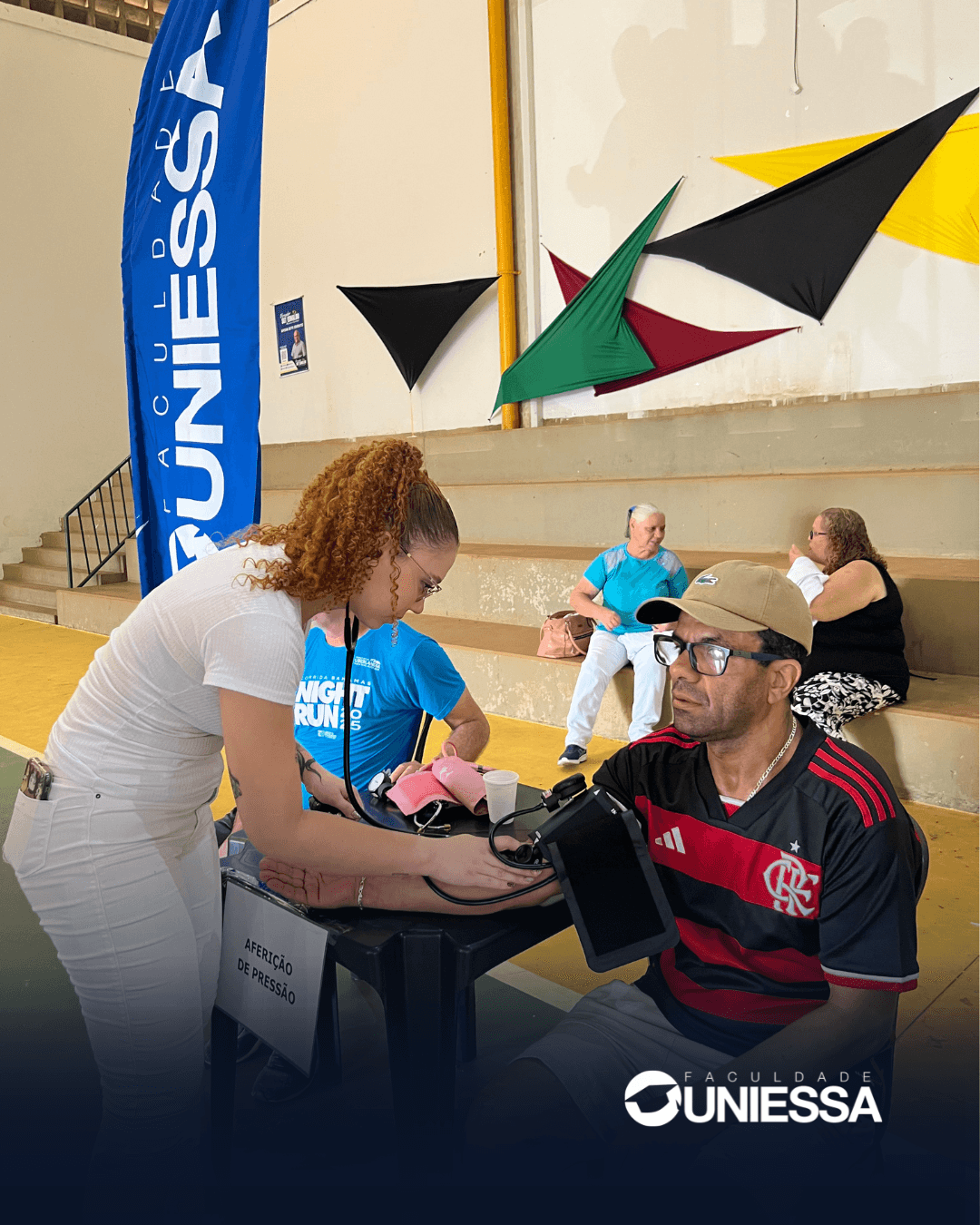Durante a programação, foram realizadas aferições de pressão arterial, oferecendo orientação básica em saúde aos participantes. A Faculdade Uniessa esteve presente por meio das alunas do curso de Enfermagem, que conduziram as ações de saúde com responsabilidade, acolhimento e compromisso social.