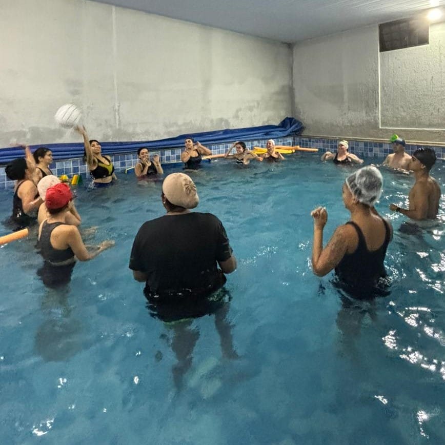 Ao final das apresentações, foi realizada uma dinâmica em grupo onde os alunos assumiram o papel de fisioterapeutas, liderando a atividade com a turma. Essa etapa final da aula incentivou a criatividade na proposição de exercícios e, ao mesmo tempo, consolidou o aprendizado sobre condutas e objetivos específicos para a fisioterapia aquática.