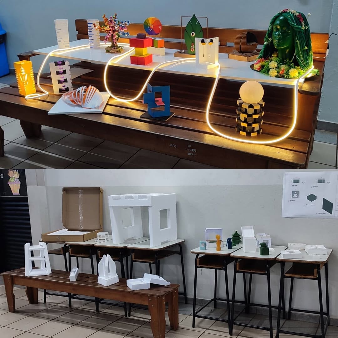 Na disciplina de "Plástica", com a professora Patrícia Borges, os alunos realizaram criações tridimensionais com modelagem, técnicas de corte e dobra.