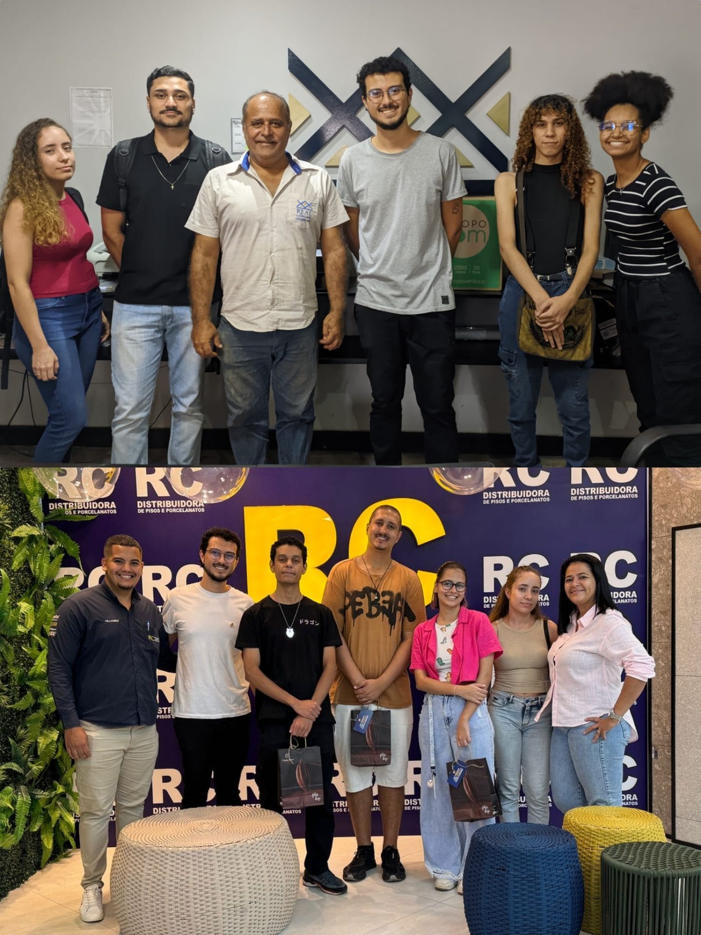Já na RC Distribuidora, eles foram recebidos pela gerente Thiara e pelo representante de vendas Yuri, que explicaram os processos de fabricação, as características dos revestimentos, as inovações do mercado e as diferenças entre cerâmica e porcelanato, além dos diversos acabamentos, formas de aplicação e itens como metais e peças cerâmicas complementares no processo de acabamento.